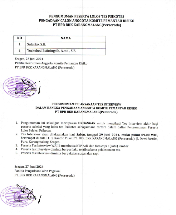 PENGUMUMAN PESERTA LOLOS TES PSIKOTES PENGADAAN CALON ANGGOTA KOMITE PEMANTAU RISIKO PT BPR BKK KARANGMALANG (Perseroda)