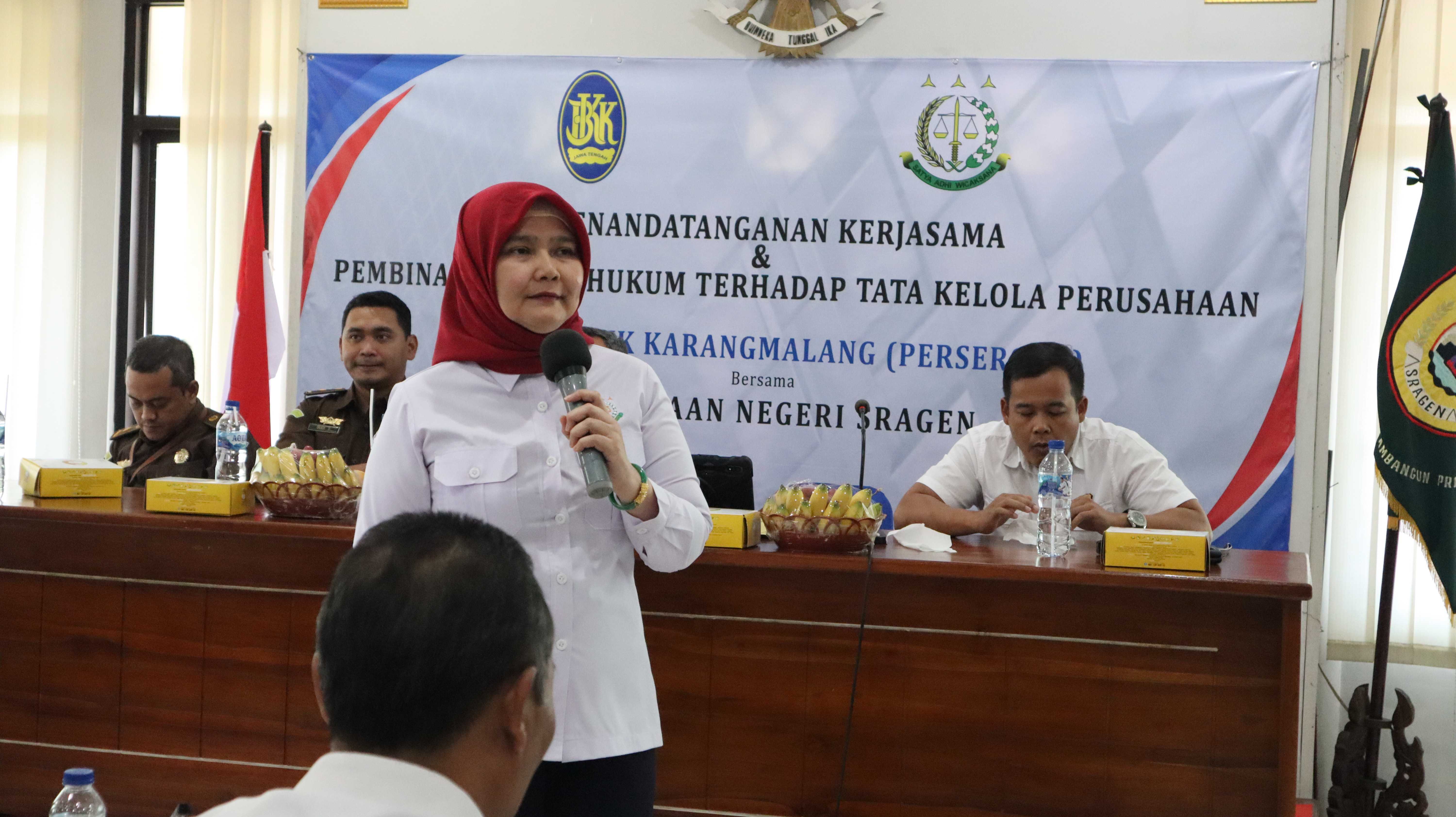 Acara tersebut kemudian dilanjutkan dengan pembinaan tentang aspek hukum terhadap tata kelola perusahaan yang disampaikan oleh narasumber dari Kejaksaan Negeri Sragen kepada peserta pembinaan yang terdiri dari Manajer Cabang, Supervisor Marketing dan Supervisor Operasional dari 15 Kantor Cabang PT BPR BKK Karangmalang (Perseroda).