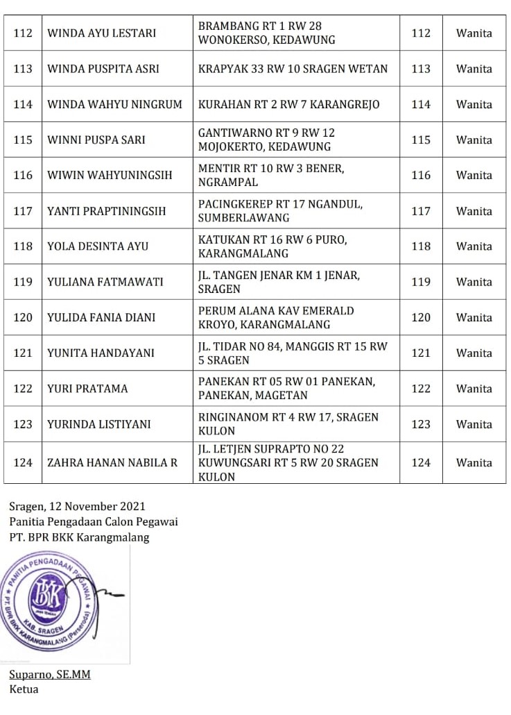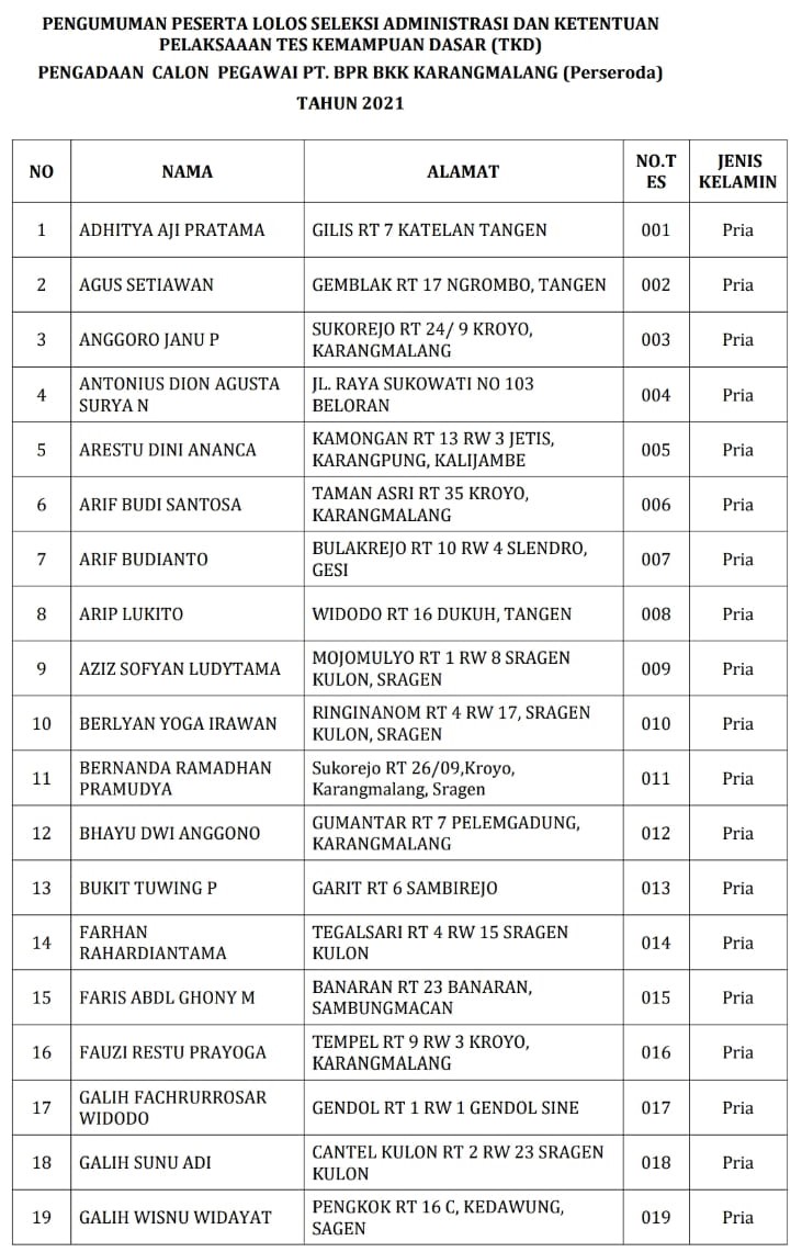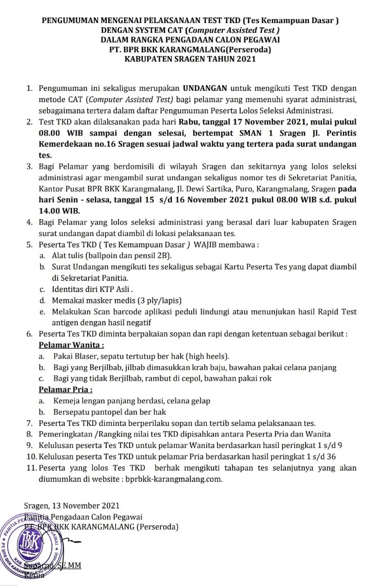 Pengadaan calon pegawai PT. BPR BKK Karangmalang (Perseroda) 2021