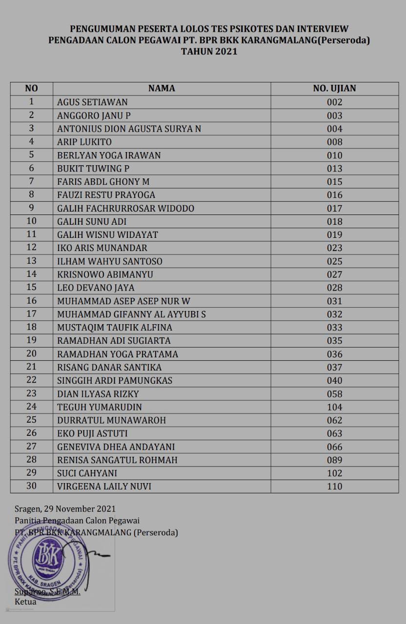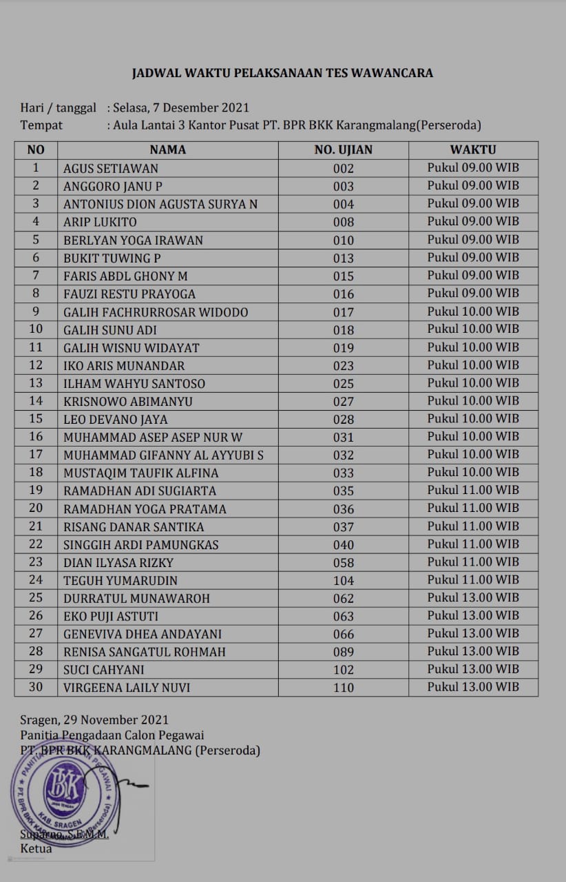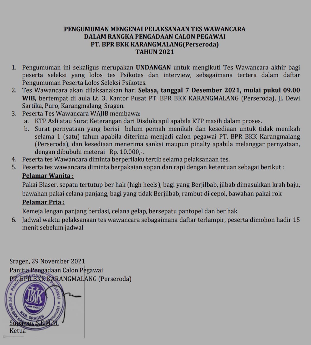 PENGUMUMAN MENGENAI PELAKSANAAN TES WAWANCARA DALAM RANGKA PENGADAAN CALON PEGAWAI PT. BPR BKK KARANGMALANG (Perseroda) TAHUN 2021