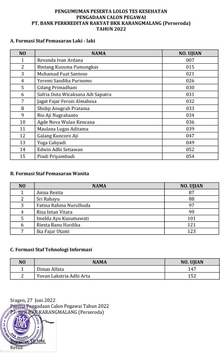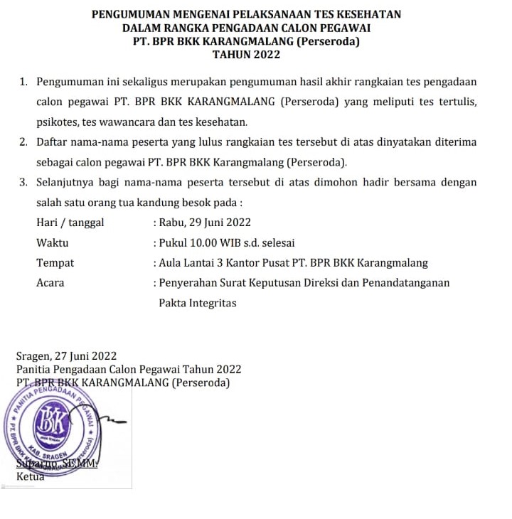 Hasil akhir rangkaian Tes Pengadaan Calon Pegawai Tahun 2022