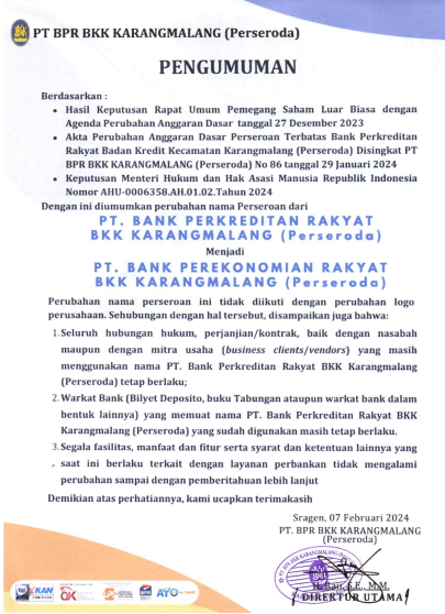 Perubahan Nama PT.BPR BKK Karangmalang (Perseroda)