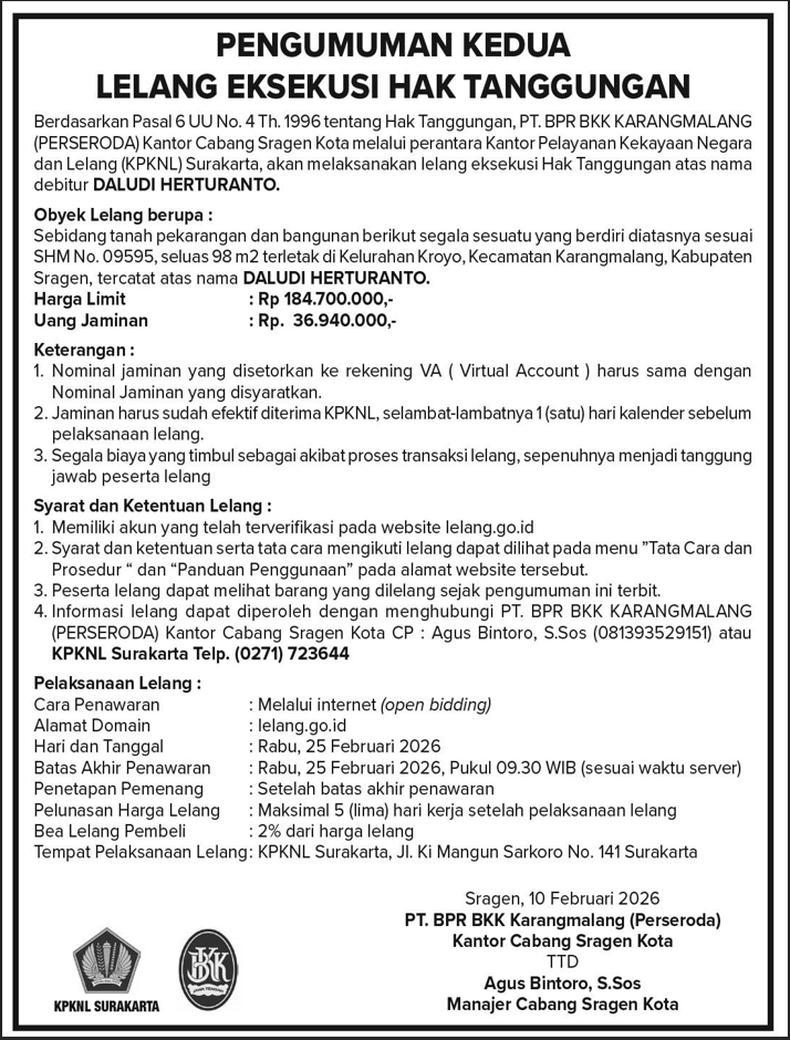 Pengumuman Kedua Lelang Eksekusi Hak Tanggungan Kantor Cabang Sragen Kota