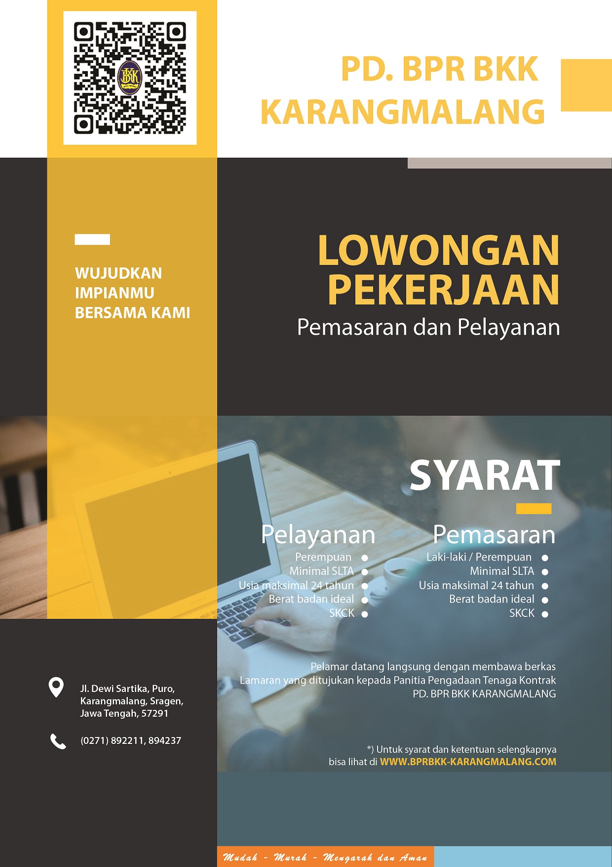 LOWONGAN KERJA PD. BPR BKK KARANGMALANG, Kabupaten Sragen, membuka lowongan pekerjaan untuk posisi sebagai berikut : No. Formasi Jumlah Formasi Jenis Kelamin Pendidikan Usia Maks. Nilai / IP Min Untuk Pelamar 1 Pemasaran 5 L/P Minimal SLTA 24 7,50 Umum 2 Pelayanan/frontliner/Teller 3 P Minimal