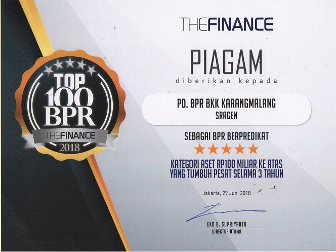 BPR BKK Karangmalang Raih Penghargaan Bintang 5 “Top 100 BPR 2018 Bintang Lima” PD. BPR BKK Karangmalang berhasil kembali menuliskan namanya