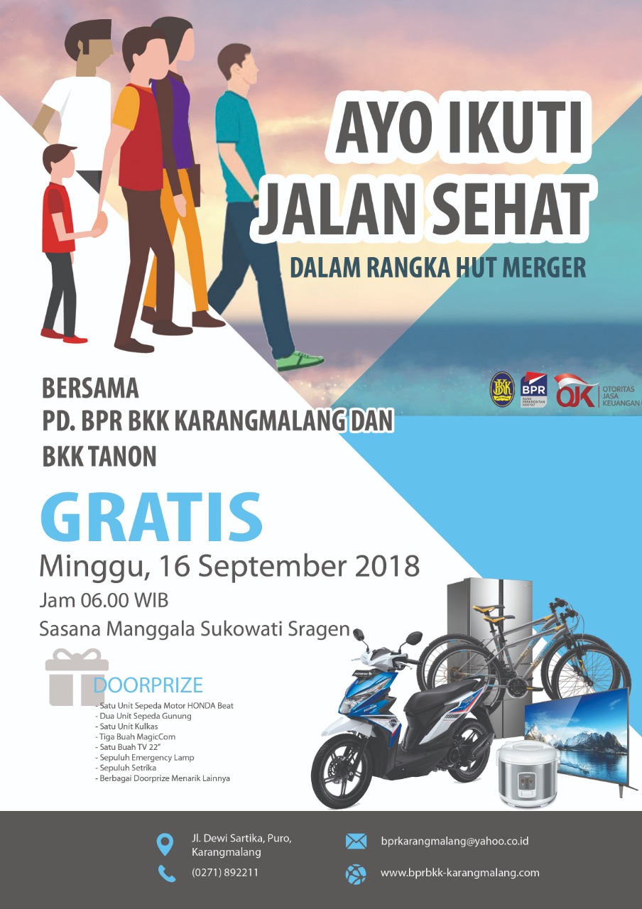 Ayo Ikuti Jalan Sehat dalam rangka HUT Merger PD BPR BKK Karangmalang dan BKK Tanon GRATIS Minggu, 16 September 2018 Jam 06.00 Sasana Manggala Sukowati Doorprize